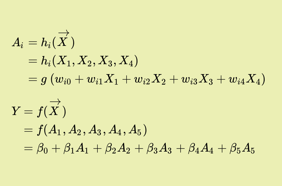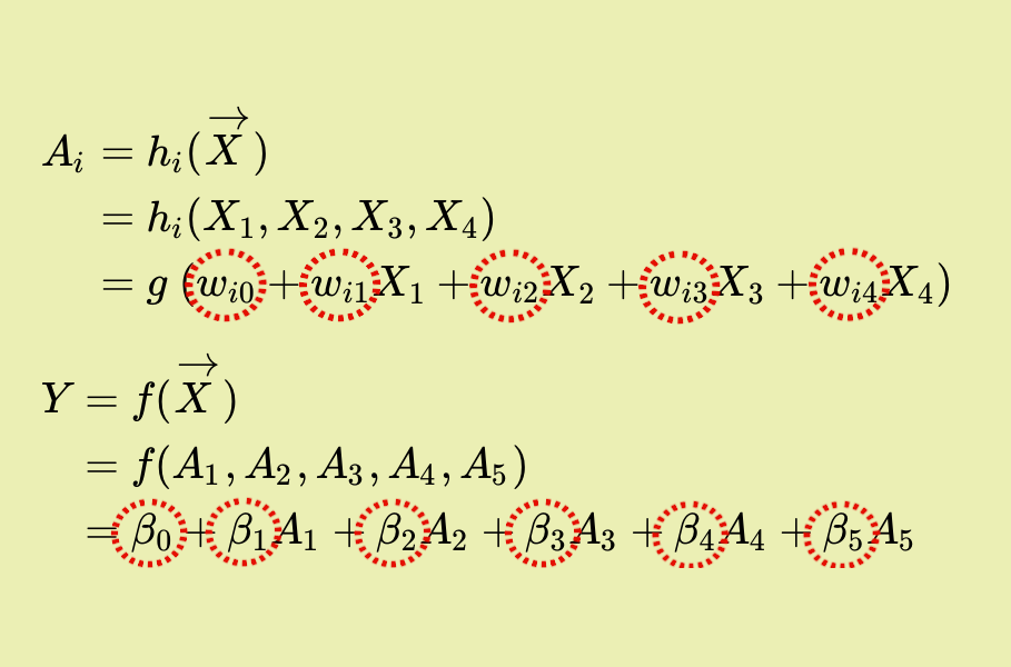 \(\phantom{A_i} = g\;(w_{i0} + w_{i1} X_1 + w_{i2} X_2 + w_{i3} X_3 + w_{i4} X_4)\)